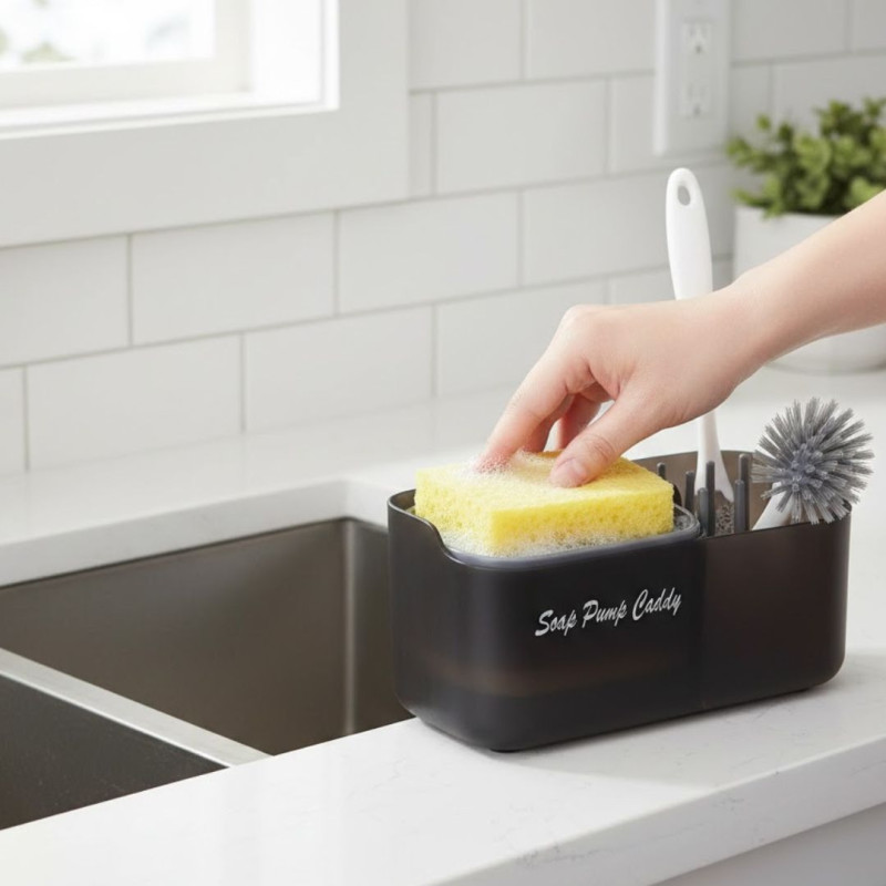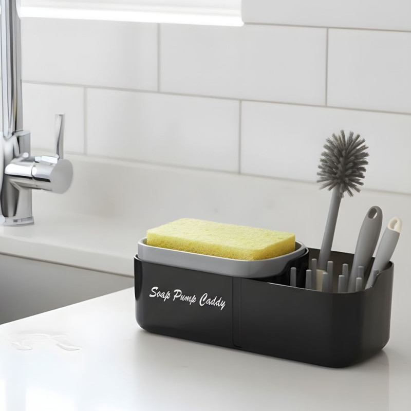 Convenient 2-in-1 caddy soap pump combining dispenser and storage.