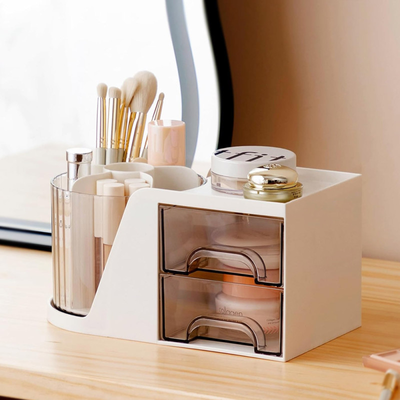 360° Rotating Desk Organizer with Mirror 2 Drawers & 7 Storage Slots