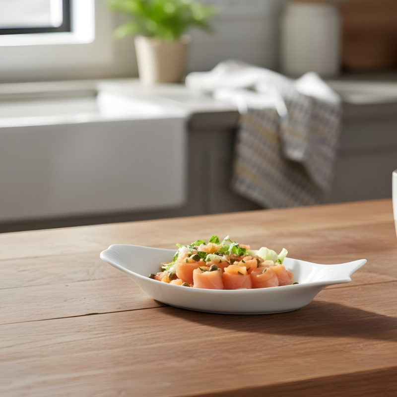 Elegant 9.75inch plate shaped for fish, ideal for serving seafood or grilled dishes.