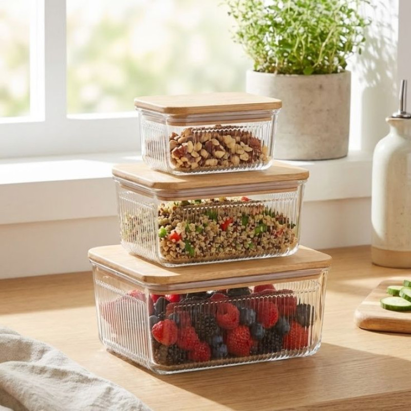 Three durable clear glass containers with wooden lids