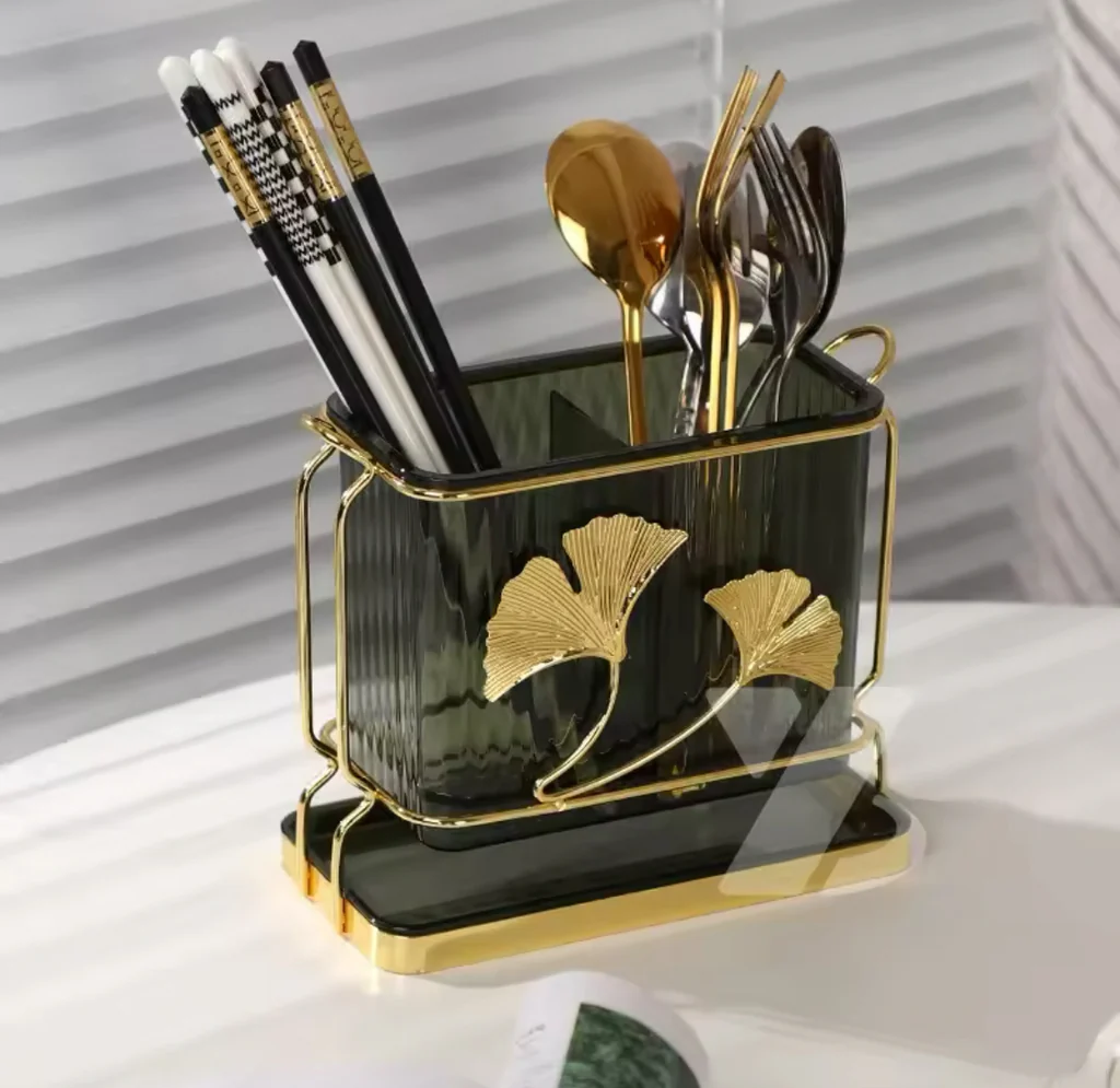 Elegant cutlery organizer with a luxurious golden leaf design for upscale dining décor.