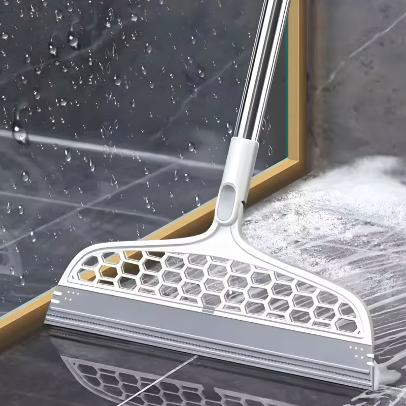 2 in 1 cleaning tool that works as both a broom and wiper for bathroom floors.