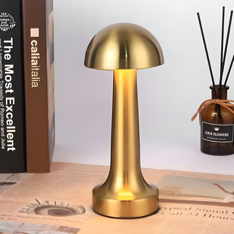 Stylish metal LED table lamp with rechargeable battery for cordless use.